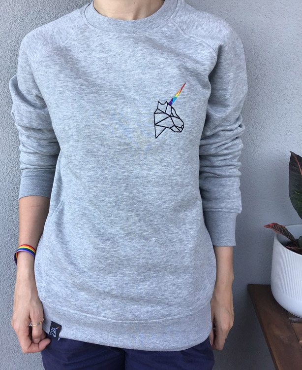 Bluza jednorożec w wersji jasnoszarej. Piękny haftowany jednorożec z tęczowym rogiem jest wspaniałą dekoracją pięknej tęczowej bluzy.