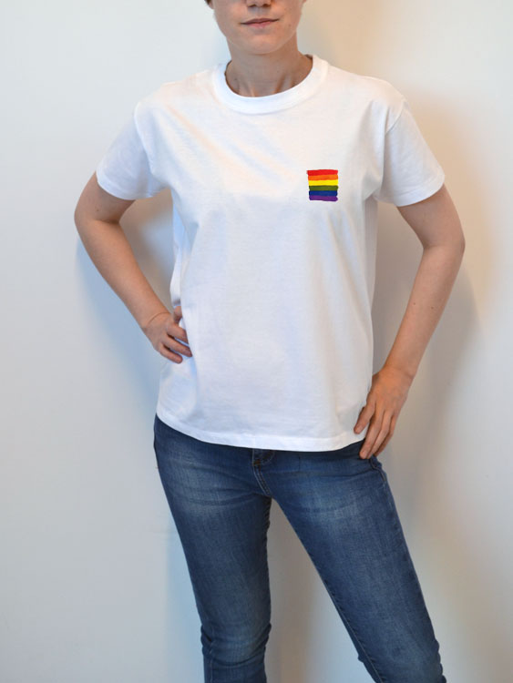 T-shirt z tęczą unisex z przodu na wysokości klatki piersiowej ma namalowaną tęczową flagę oraz na dole z przodu wszytą naszą metkę „jednorożec”.
