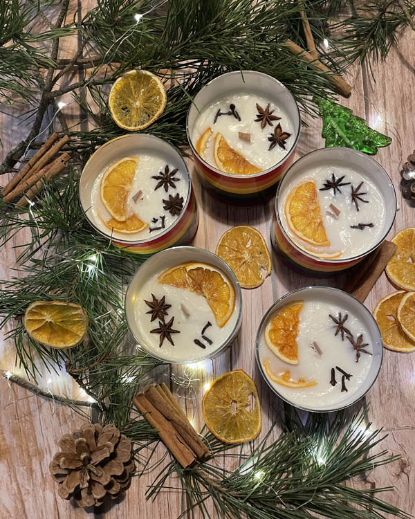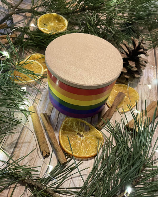 Świecę zrobiłyśmy ręcznie z naturalnego wosku sojowego. Dodałyśmy do niej olejki eteryczne (10%, nie da się nie poczuć!) o zapachu goździków, cynamonu i pomarańczy. Po zapaleniu świecy olejki są stopniowo uwalniane, a Ty poczujesz, że z każdą minutą jest Ci bardziej błogo i cudownie. Jakby tego było mało, świeczkę udekorowałyśmy suszoną pomarańczką, goździkami i anyżem. Nie mogło też zabraknąć tęczowego opakowania (no raczej!) To się dopiero nazywa strefa przyjazna LGBT!