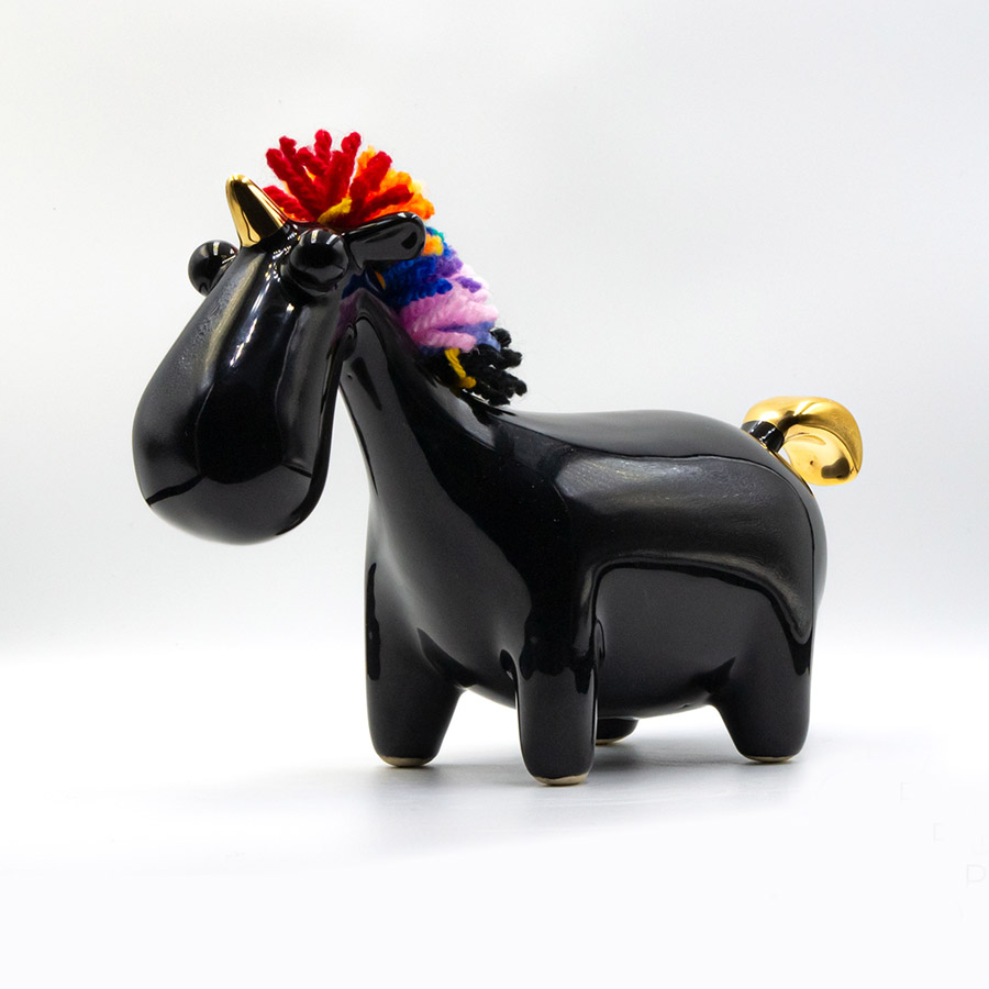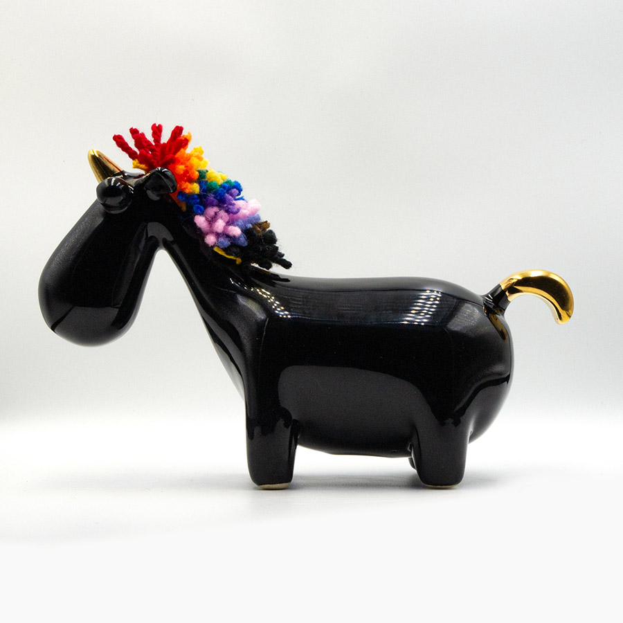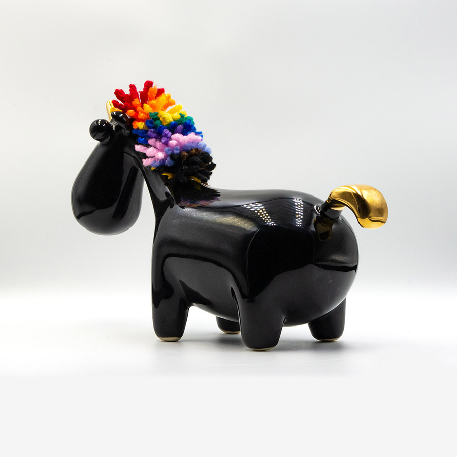 Figurka wykonana jest w maleńkich seriach z wysokiej jakości emaliowanej ceramiki.  Całość dopełnia wykonana ręcznie grzywa, w pięknych żywych kolorach tęczowej flagi. Każda grzywa robiona jest indywidualnie z wysokiej jakości włóczki akrylowej. Poprzez połączenie twardej, gładkiej ceramiki z miękką i puchatą