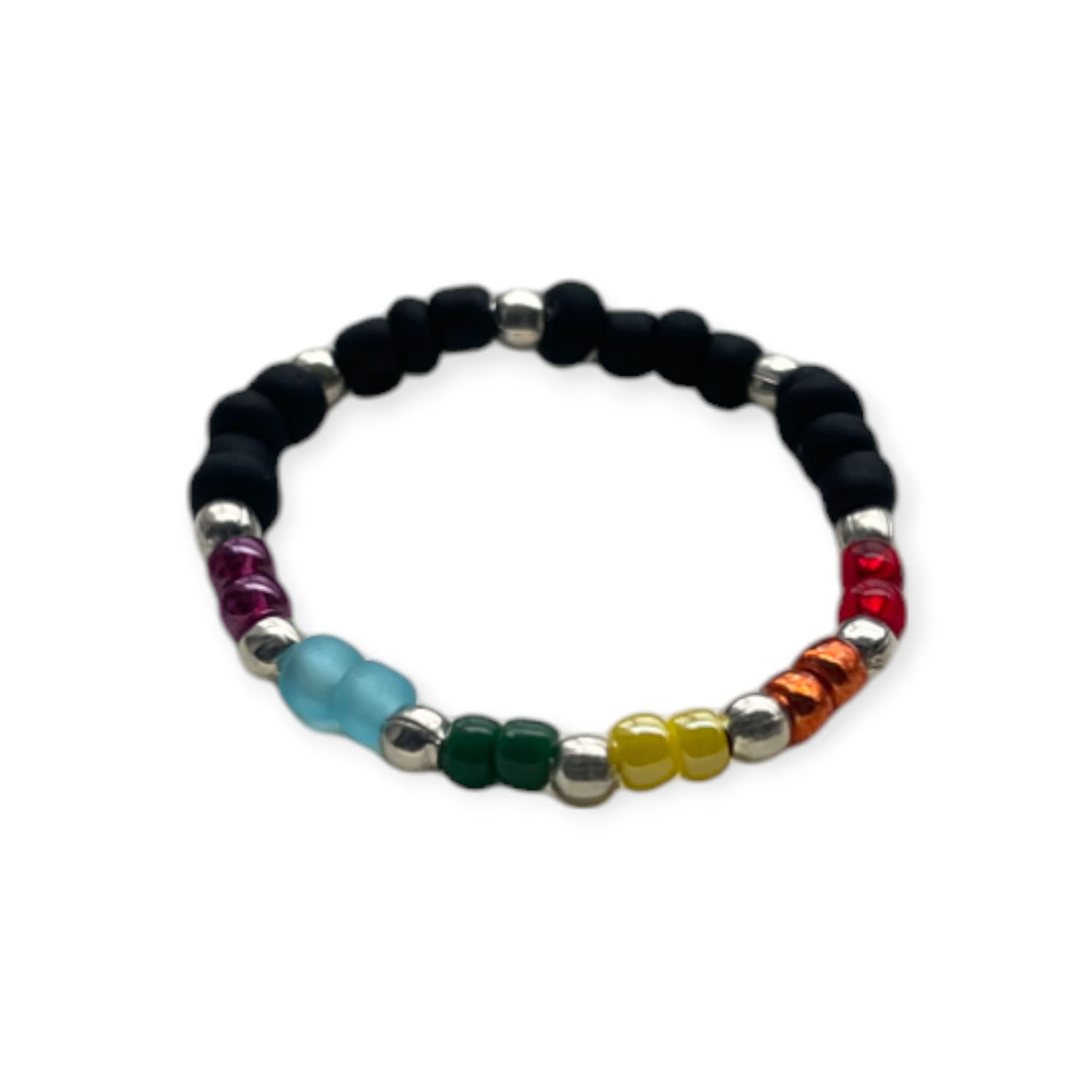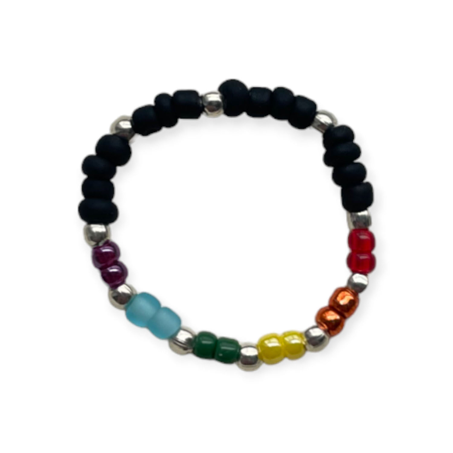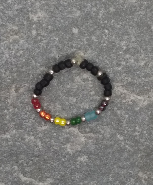 Unikalny tęczowy pierścionek LGBT z minimalistycznymi czarnymi i srebrnymi koralikami oraz pełną tęczą.
